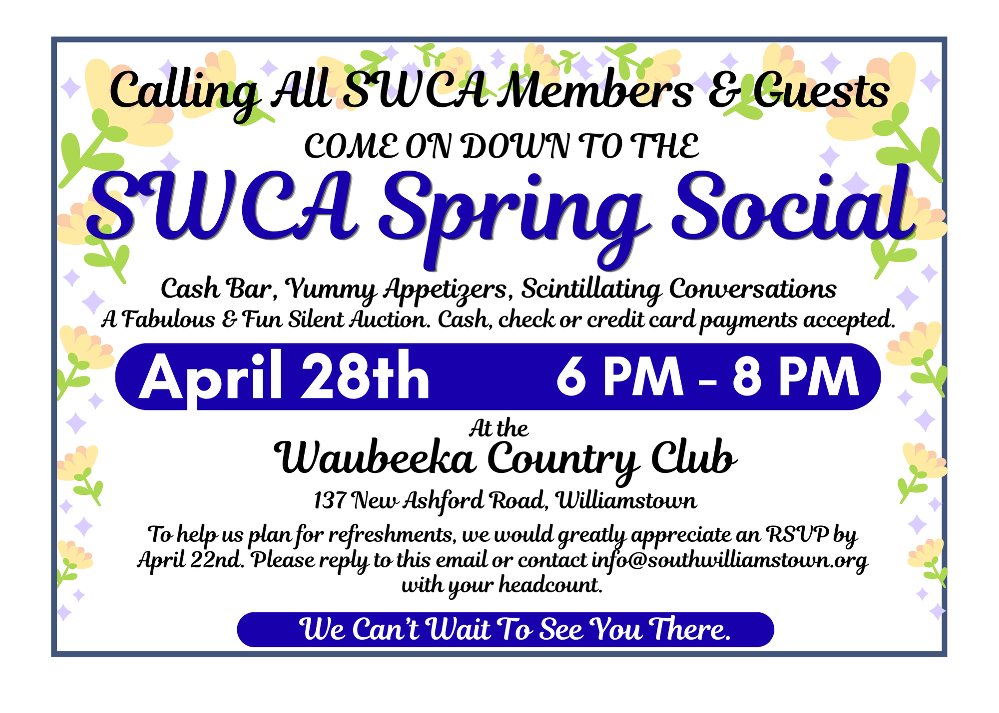 The SWCA Spring Social will take place April 28th from 6 PM – 8 PM at the Waubeeka Country Club, 137 New Ashford Road, Williamstown.
